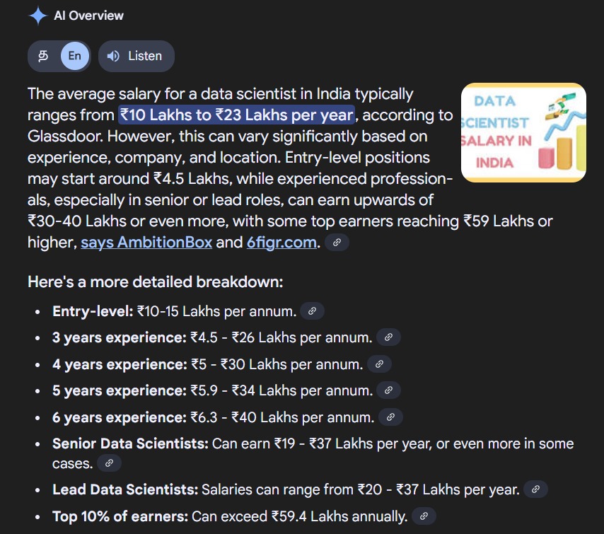 The average salary for a Data Scientist in India ranges from ₹10 to ₹23 Lakh Per Annum (LPA), according to Glassdoor .