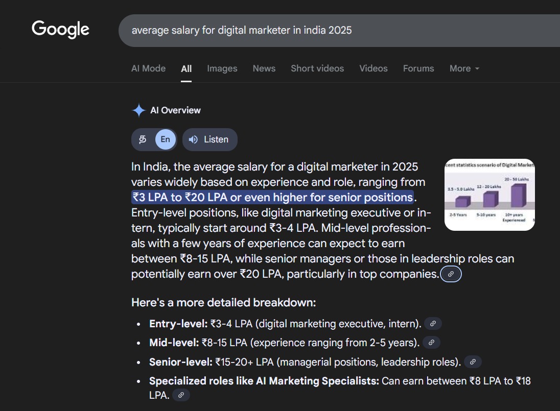 The average salary for a Digital Marketer in India is around ₹3LPA to ₹20LPA, according to Glassdoor.
