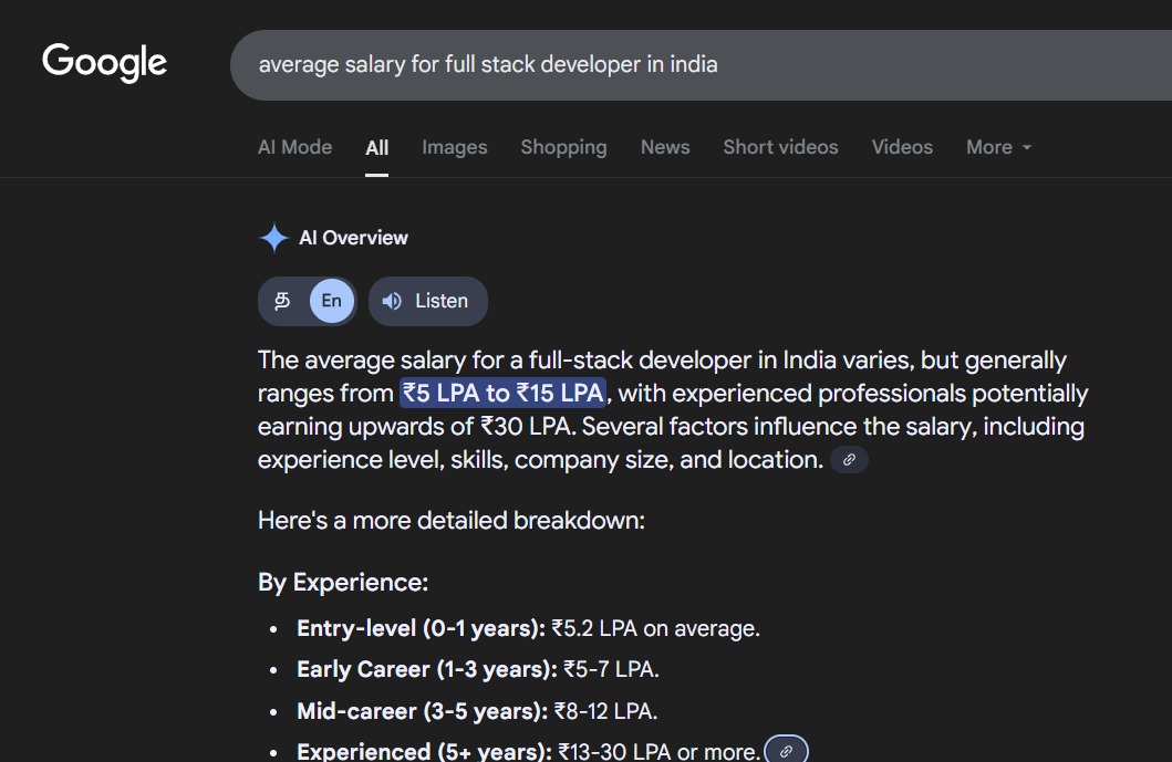 The average salary for a full stack developer in India is around ₹10.6 Lakh Per Annum (LPA) according to Glassdoor.